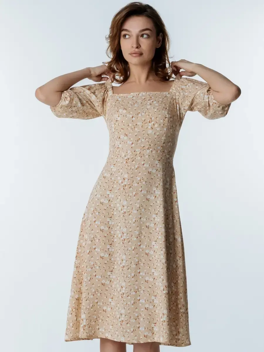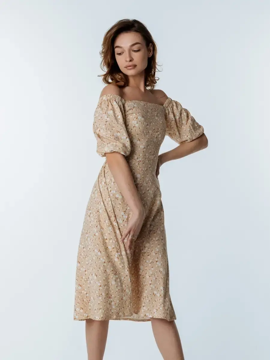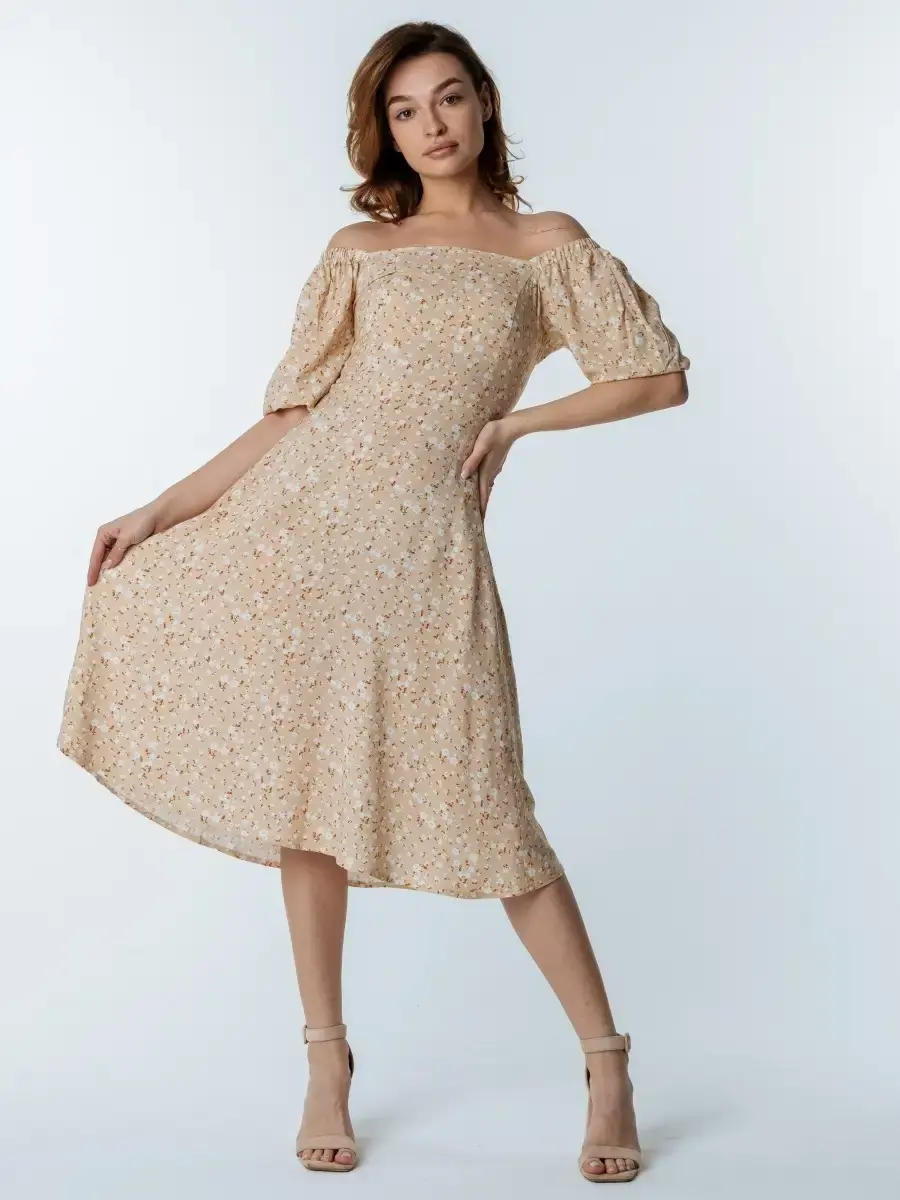 Легкое, свободное и красивое платье крестьянка с цветочным принтом станет прекрасным выбором одежды на весенний или летний сезон. Сарафан сшит из вискозы, которая хорошо впитывает влагу и дышит, что особенное актуально для жаркого времени года. Платье-сарафан с объемными рукавами фонариками и квадратным вырезом имеет приталенный А - силуэт. Милое бежевое платье миди с цветами поможет создать стильные, нежные праздничные и пляжные образы. Наряд с голыми плечами отлично подчеркнет фигуру и идеально подойдет для фотосессии. Платье-крестьянка ниже колен - яркий и комфортный повседневный образ для девушек и женщин на лето. Вещи, сочетающие в себе стиль и комфорт, — лучшее дополнение в гардероб!