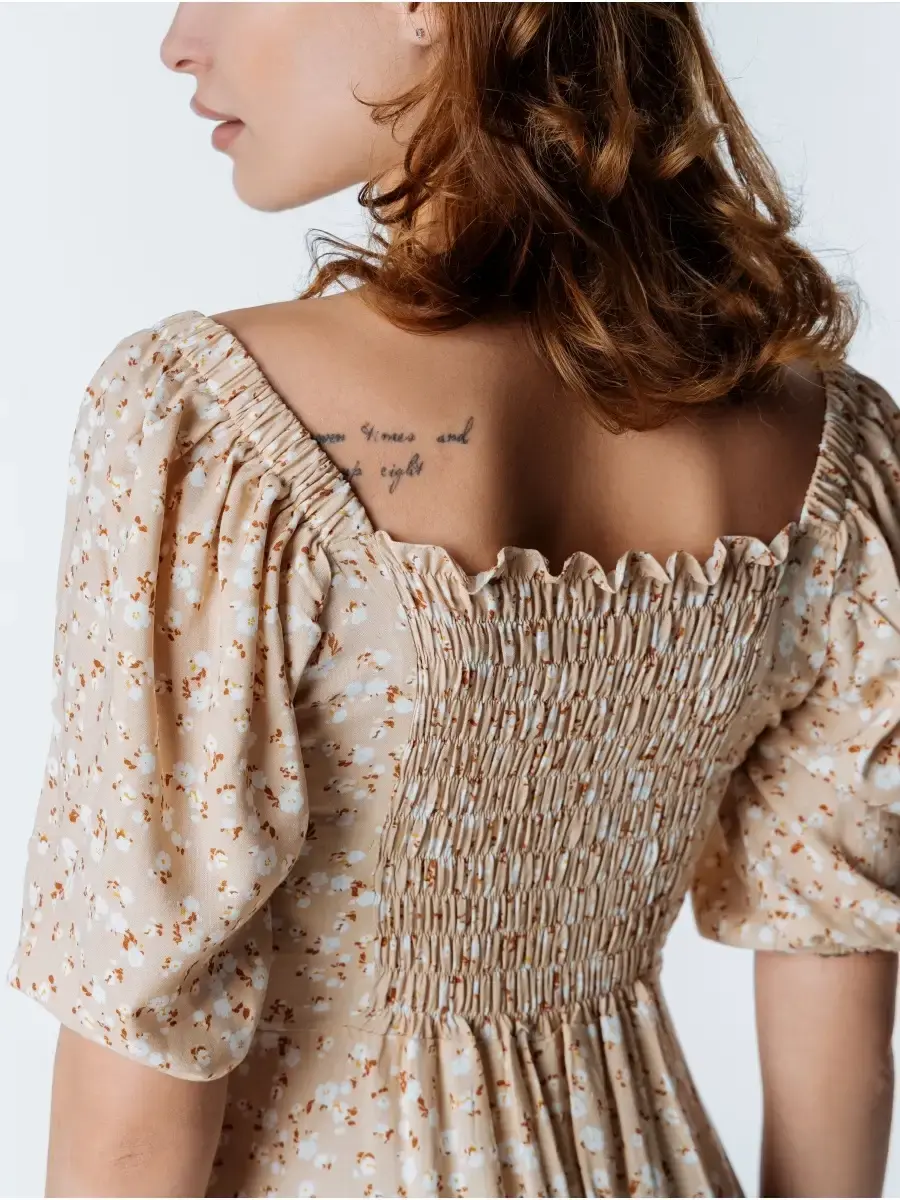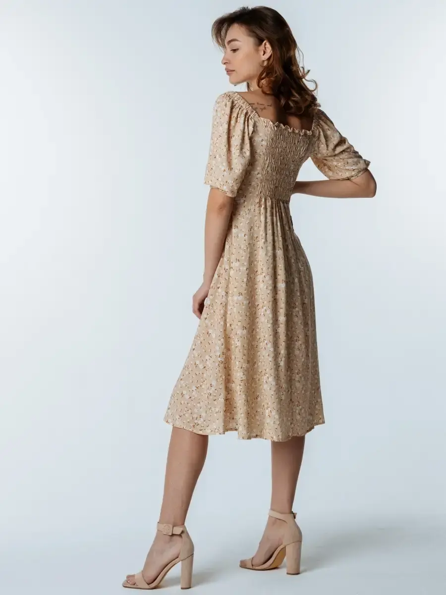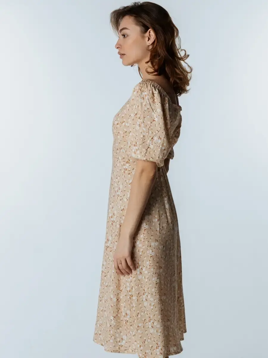 Легкое, свободное и красивое платье крестьянка с цветочным принтом станет прекрасным выбором одежды на весенний или летний сезон. Сарафан сшит из вискозы, которая хорошо впитывает влагу и дышит, что особенное актуально для жаркого времени года. Платье-сарафан с объемными рукавами фонариками и квадратным вырезом имеет приталенный А - силуэт. Милое бежевое платье миди с цветами поможет создать стильные, нежные праздничные и пляжные образы. Наряд с голыми плечами отлично подчеркнет фигуру и идеально подойдет для фотосессии. Платье-крестьянка ниже колен - яркий и комфортный повседневный образ для девушек и женщин на лето. Вещи, сочетающие в себе стиль и комфорт, — лучшее дополнение в гардероб!