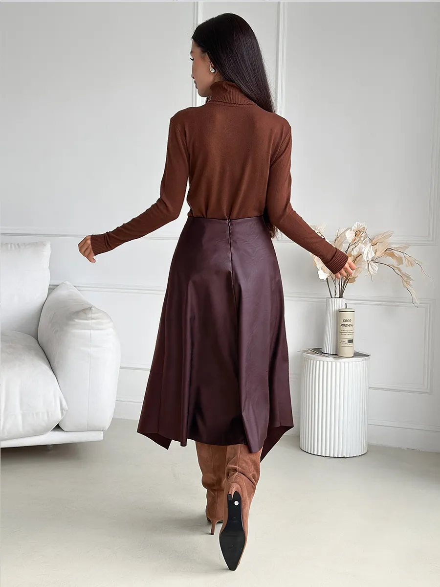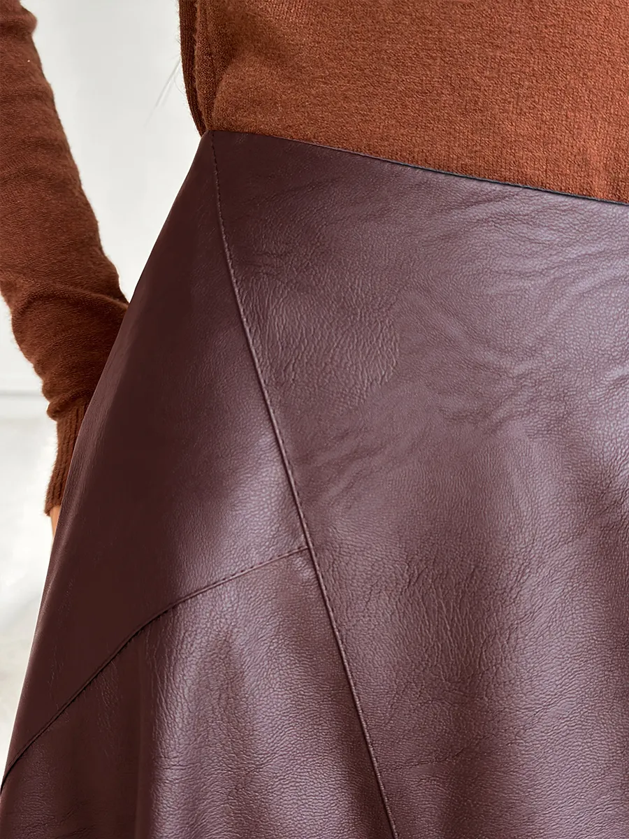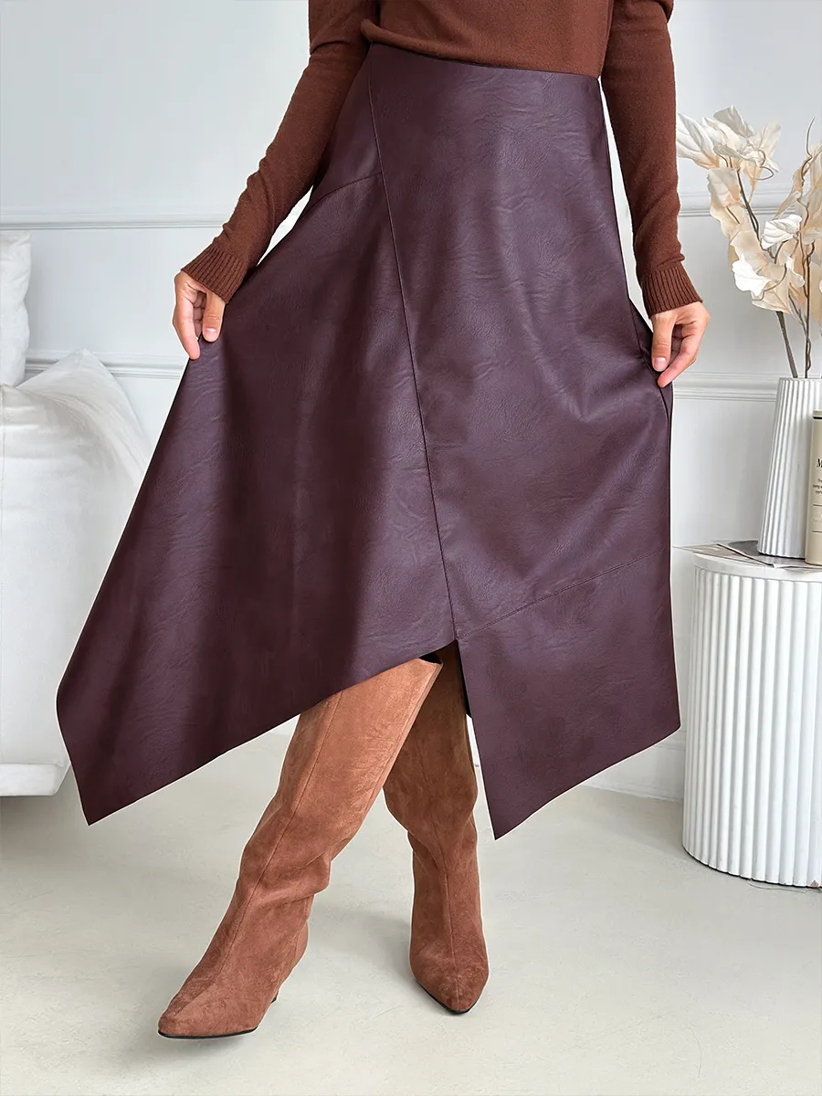 Стильная кожаная юбка с асимметричным кроем — это модная вещь для современной женщины. Выполненная из экокожи, она сочетает в себе трендовый силуэт трапеция и необычный разрез, который подчеркивает индивидуальность. Коричневый цвет с оттенками бордо, вишневого и сливового делает эту юбку универсальной для весеннего и зимнего сезонов. Клешевый фасон придает образу легкость и динамичность, а средняя длина миди подходит для офисного и нарядного стиля.