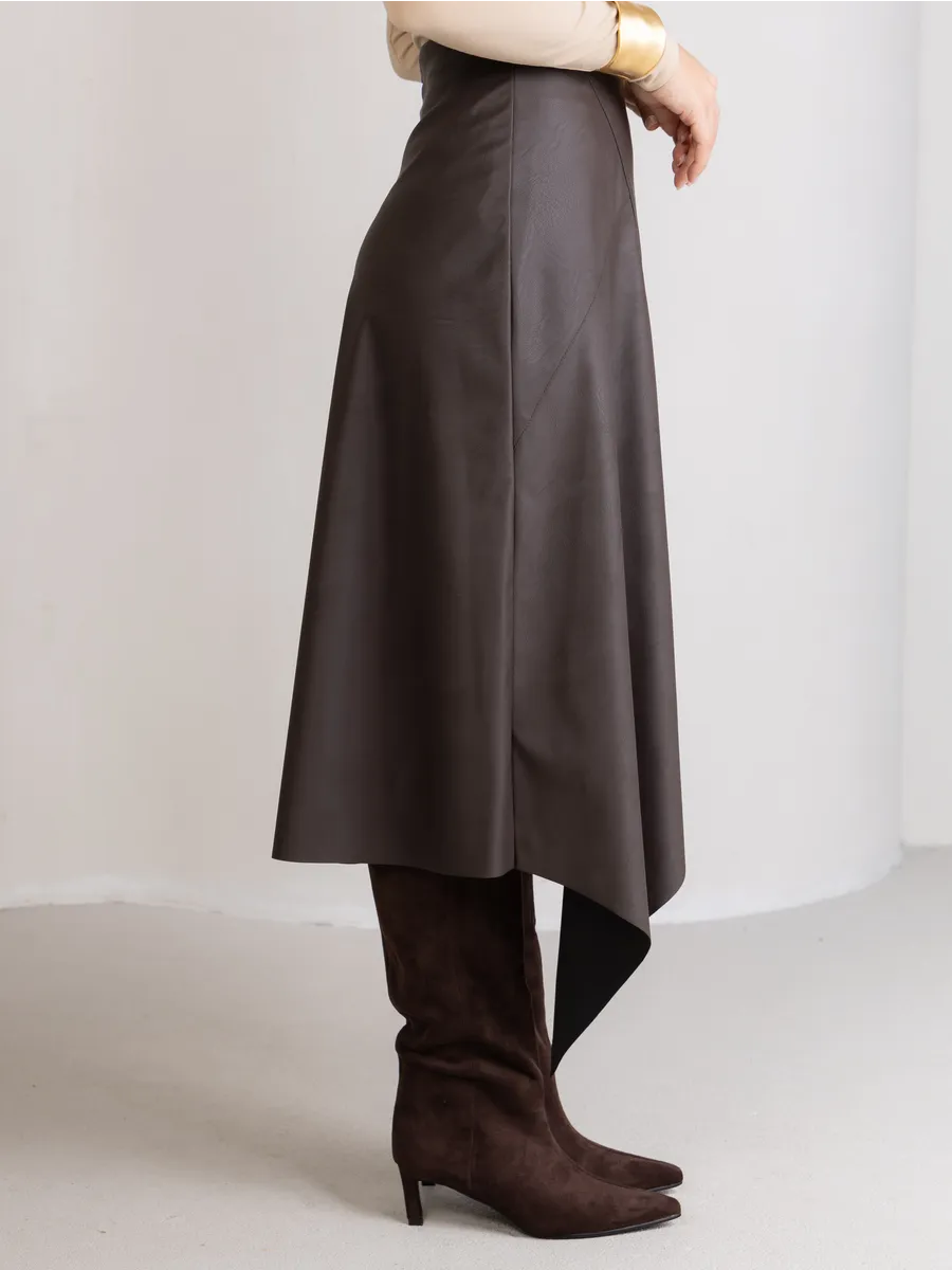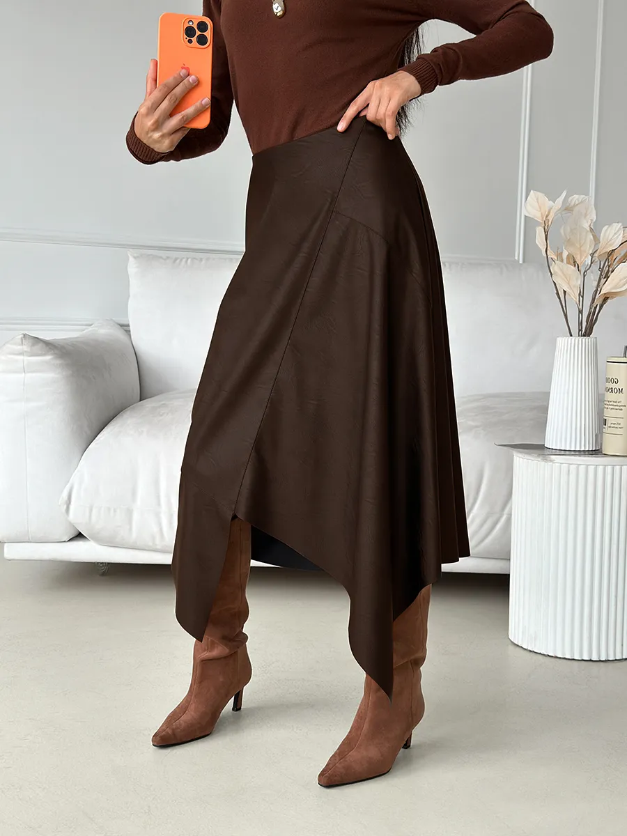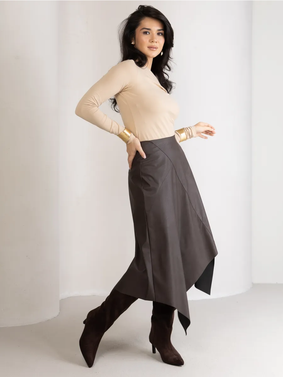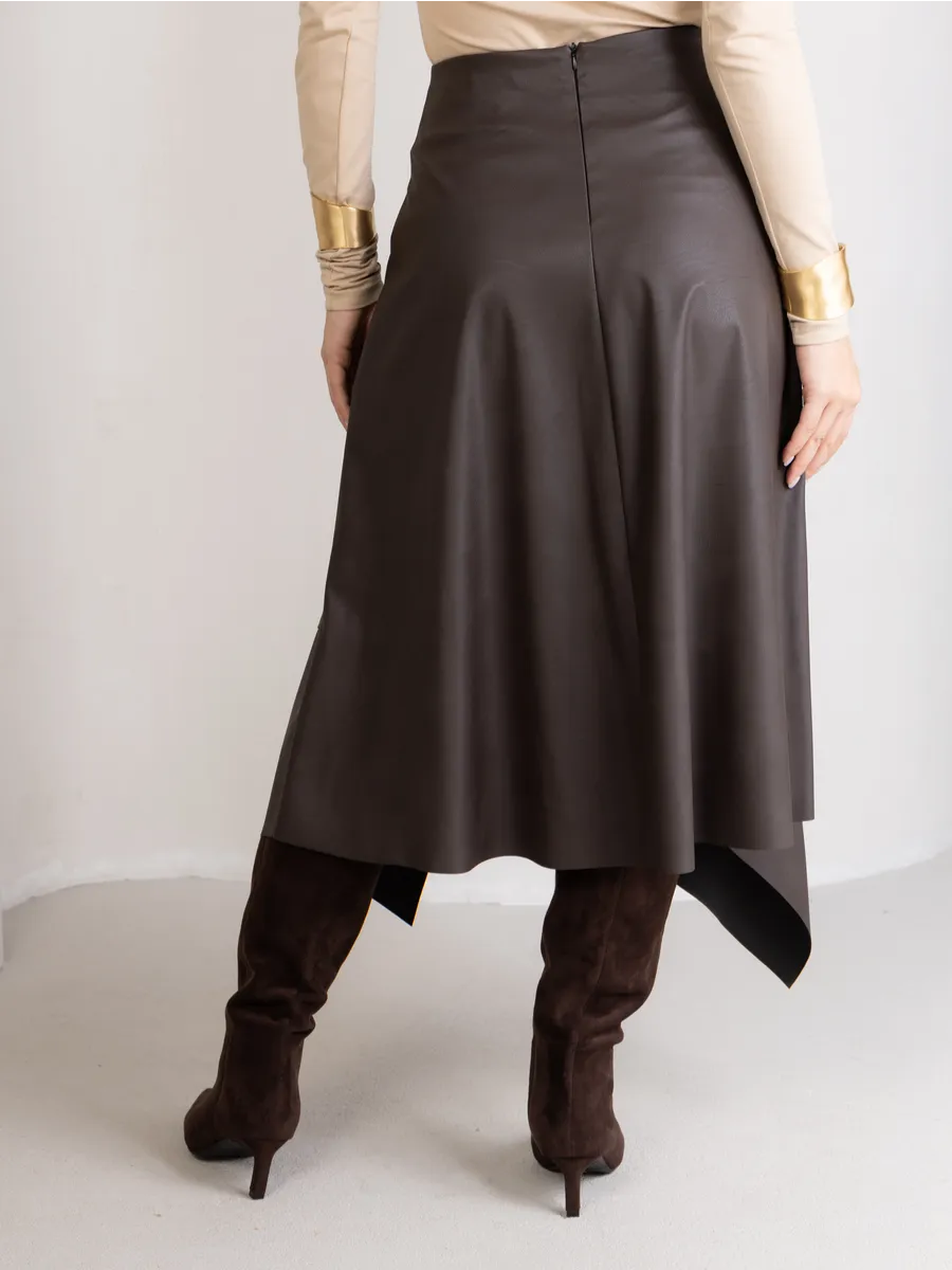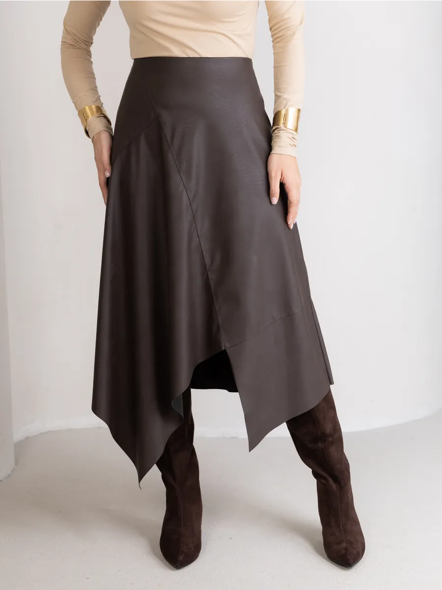 Стильная кожаная юбка с асимметричным кроем — это модная вещь для современной женщины. Выполненная из экокожи, она сочетает в себе трендовый силуэт трапеция и необычный разрез, который подчеркивает индивидуальность. Идеально для весеннего и зимнего сезонов. Клешевый фасон придает образу легкость и динамичность, а средняя длина миди подходит для офисного и нарядного стиля.