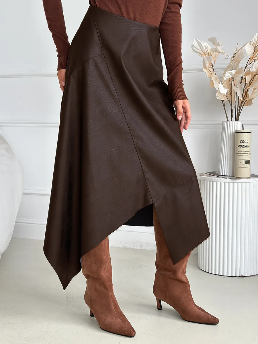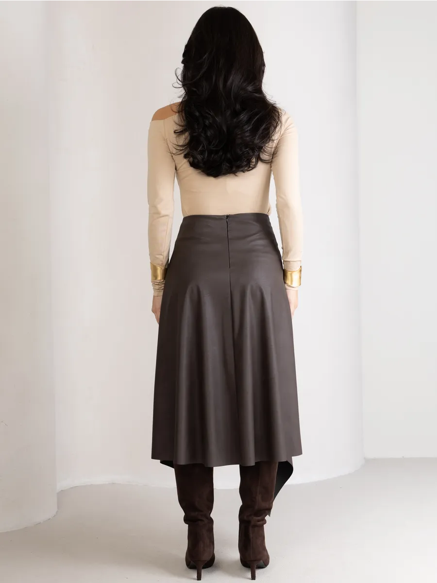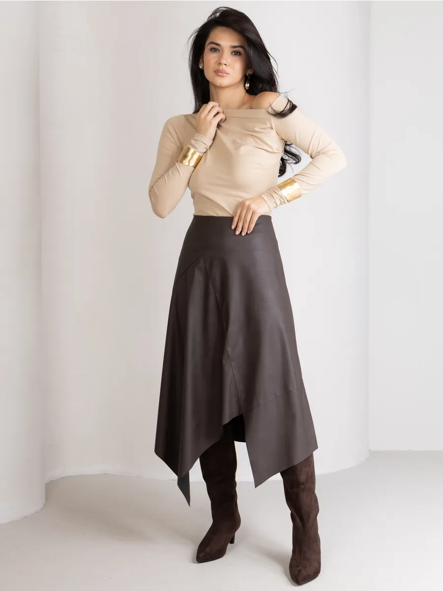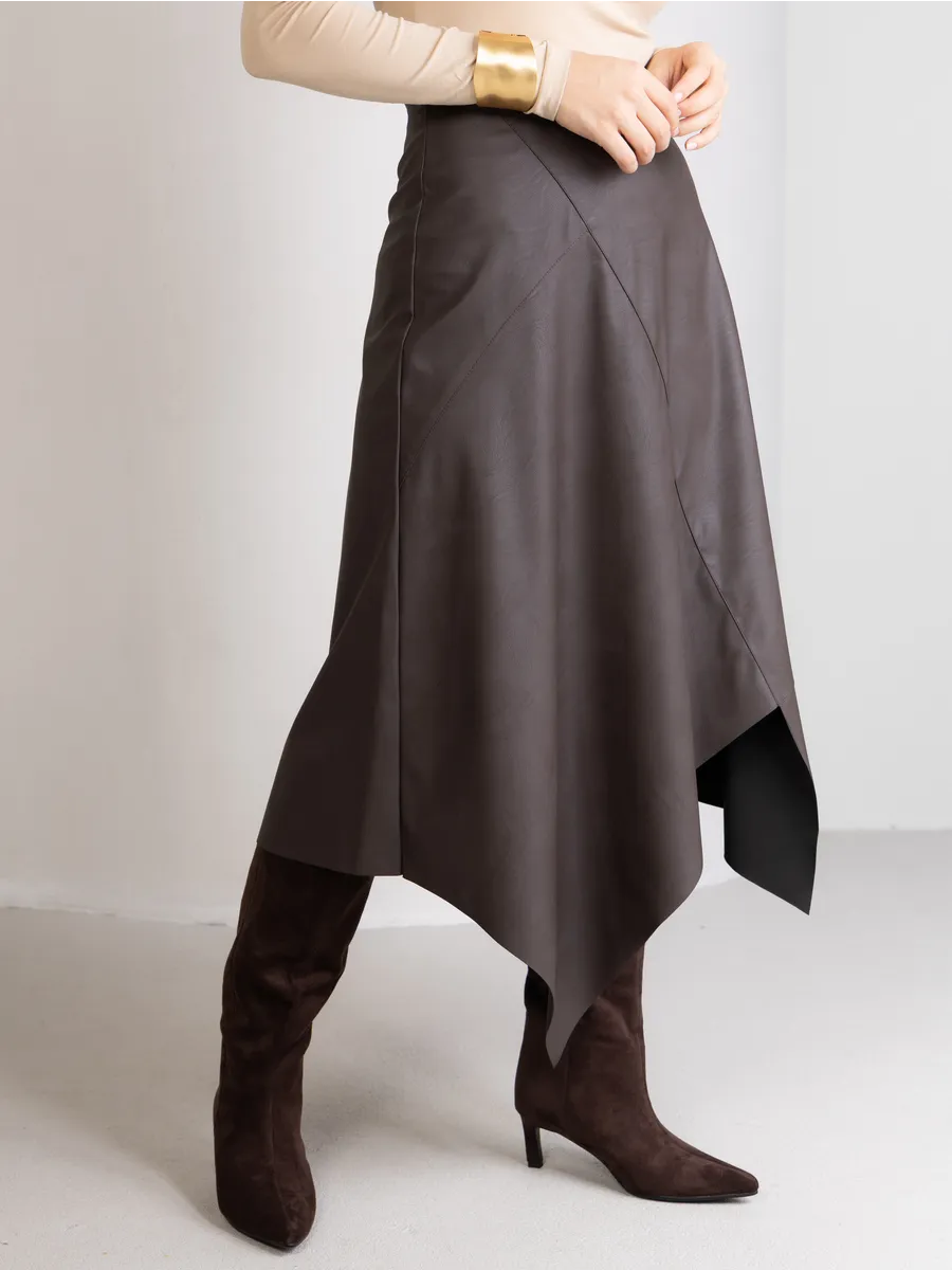 Стильная кожаная юбка с асимметричным кроем — это модная вещь для современной женщины. Выполненная из экокожи, она сочетает в себе трендовый силуэт трапеция и необычный разрез, который подчеркивает индивидуальность. Идеально для весеннего и зимнего сезонов. Клешевый фасон придает образу легкость и динамичность, а средняя длина миди подходит для офисного и нарядного стиля.