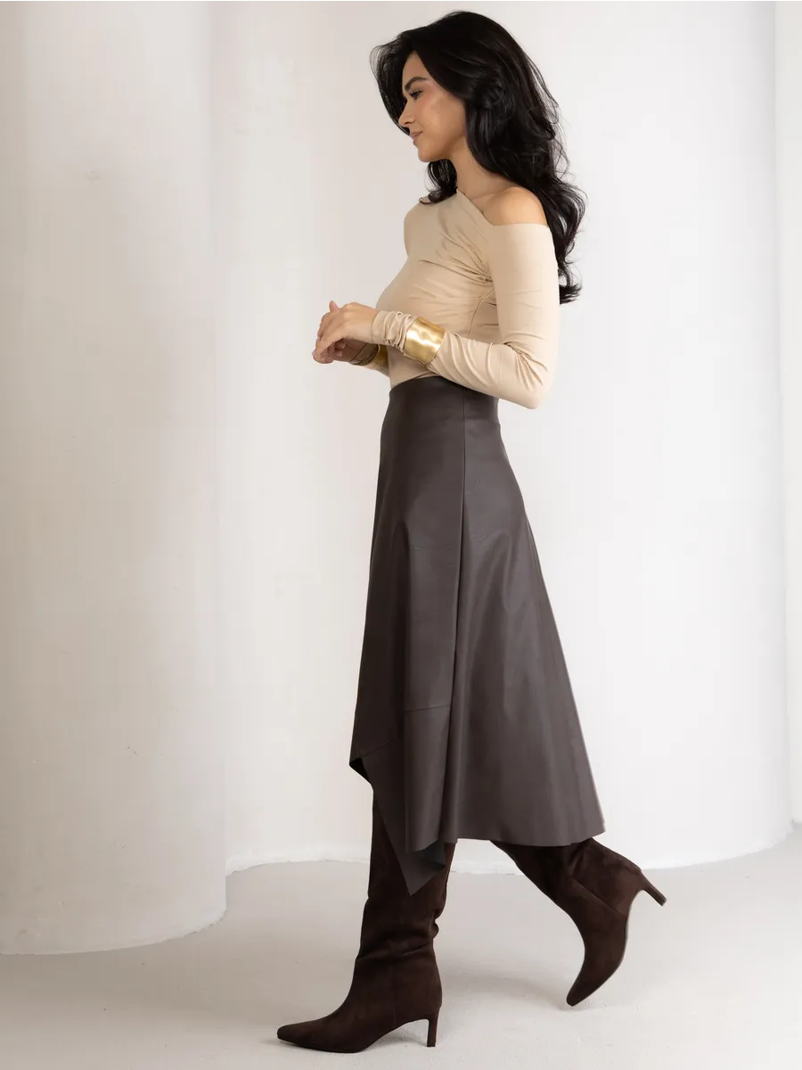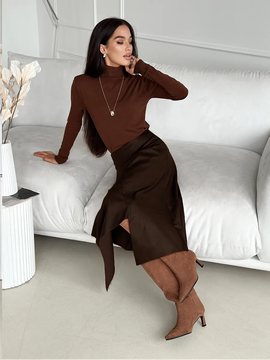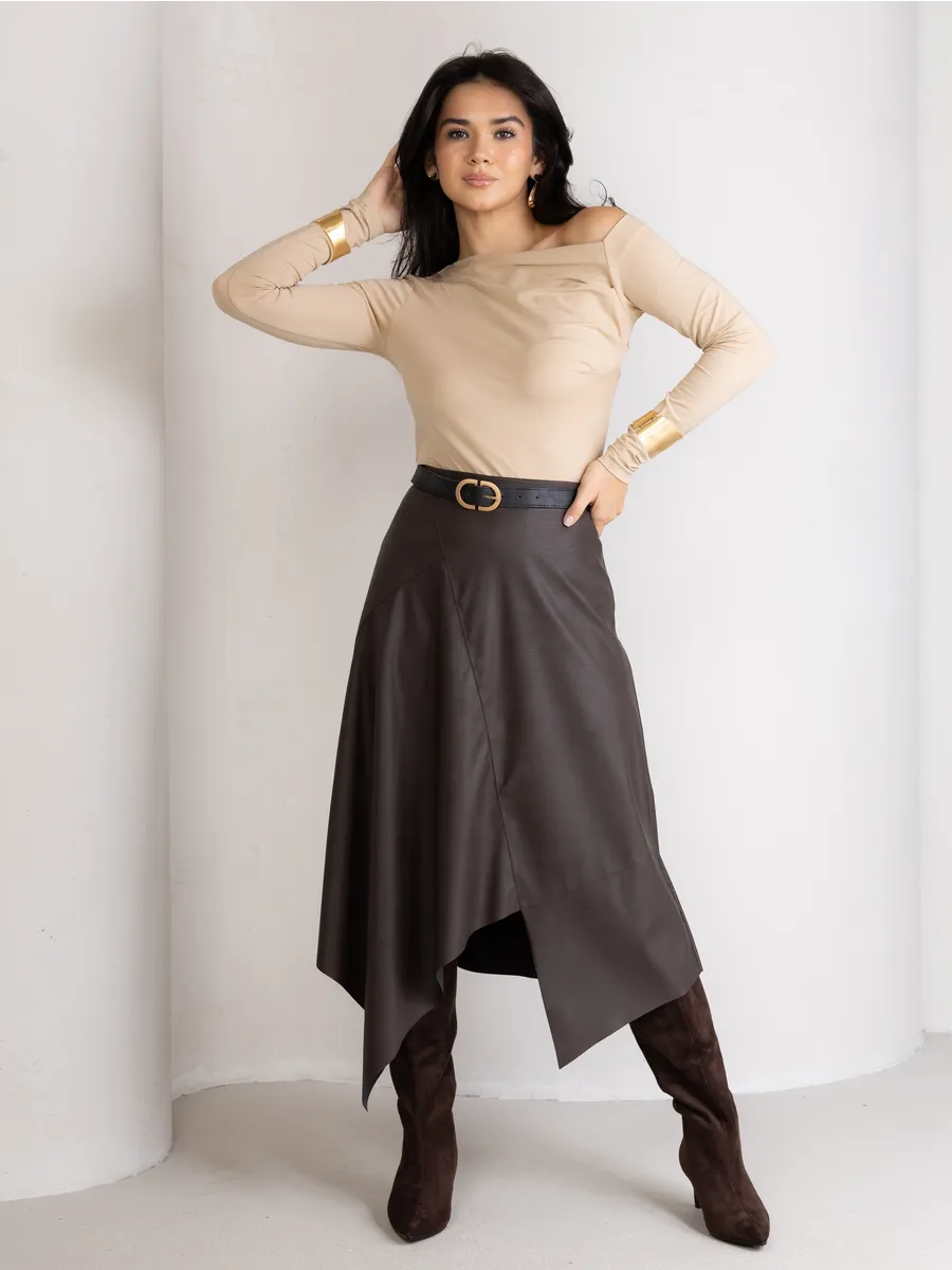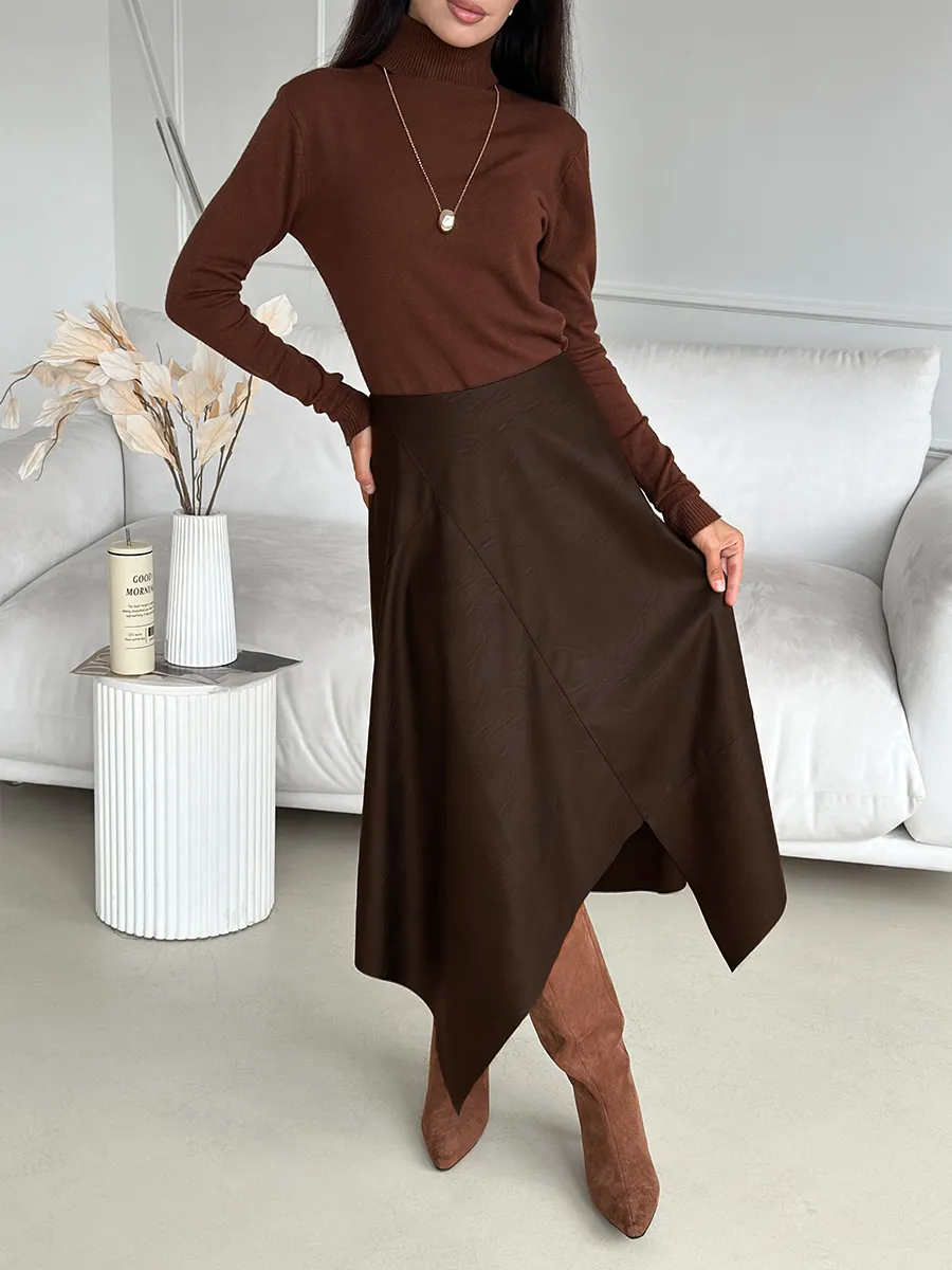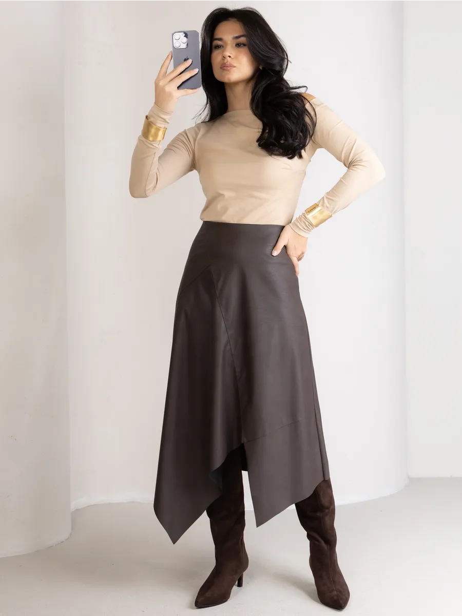 Стильная кожаная юбка с асимметричным кроем — это модная вещь для современной женщины. Выполненная из экокожи, она сочетает в себе трендовый силуэт трапеция и необычный разрез, который подчеркивает индивидуальность. Идеально для весеннего и зимнего сезонов. Клешевый фасон придает образу легкость и динамичность, а средняя длина миди подходит для офисного и нарядного стиля.