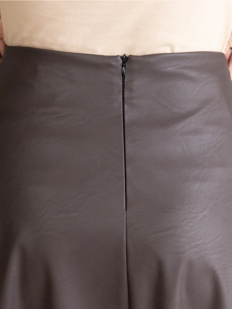 Юбка отлично впишется в гардероб женщины любого размера и роста благодаря продуманному крою и комфортному посадке. Кожзам высокого качества обеспечивает долговечность и практичность, а асимметрия добавляет оригинальности и подчеркнет модный тренд. Эта вещь станет удачным выбором для весеннего и осеннего сезонов, гармонично сочетаясь с разными элементами одежды.