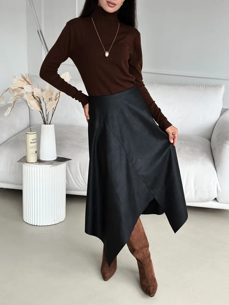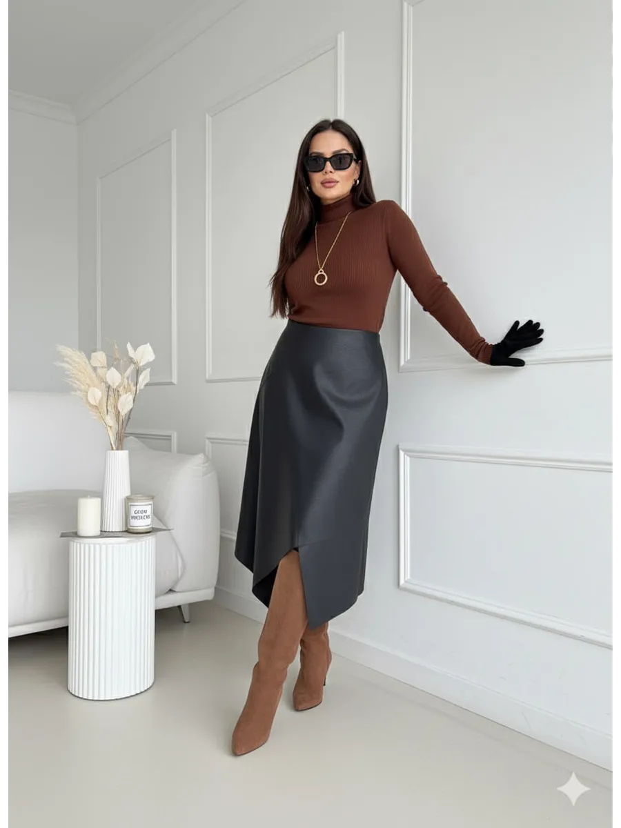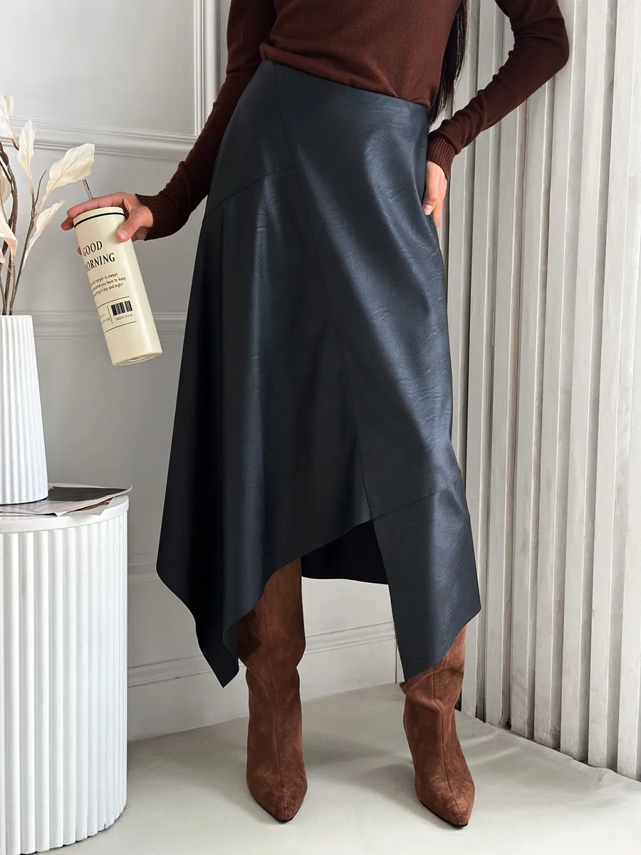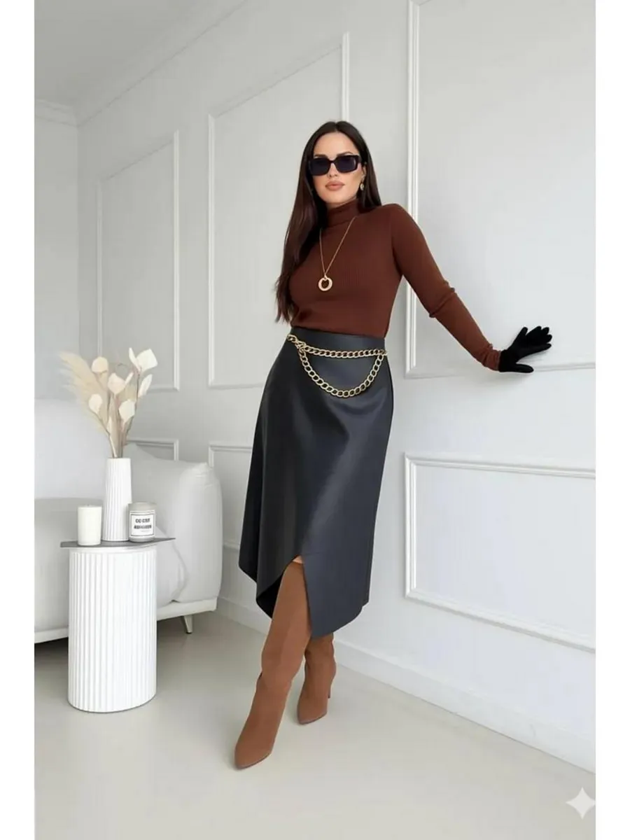 Стильная кожаная юбка с асимметричным кроем — это модная вещь для современной женщины. Выполненная из экокожи, она сочетает в себе трендовый силуэт трапеция и необычный разрез, который подчеркивает индивидуальность. Идеально для весеннего и зимнего сезонов. Клешевый фасон придает образу легкость и динамичность, а средняя длина миди подходит для офисного и нарядного стиля.