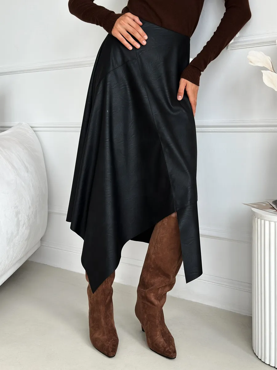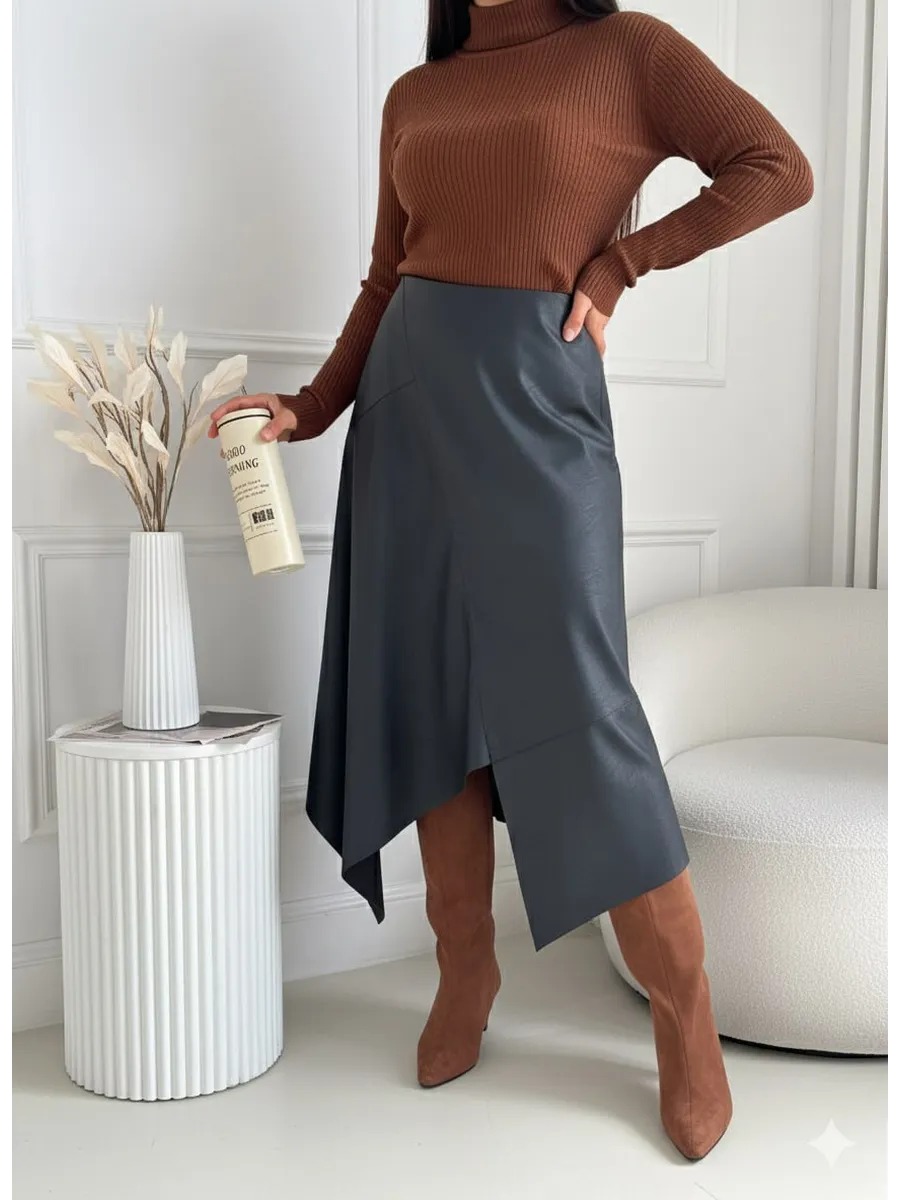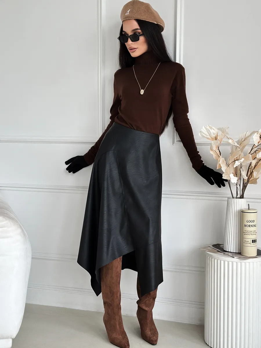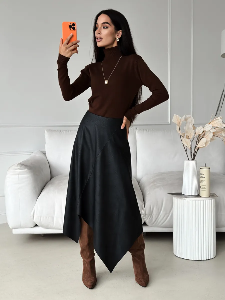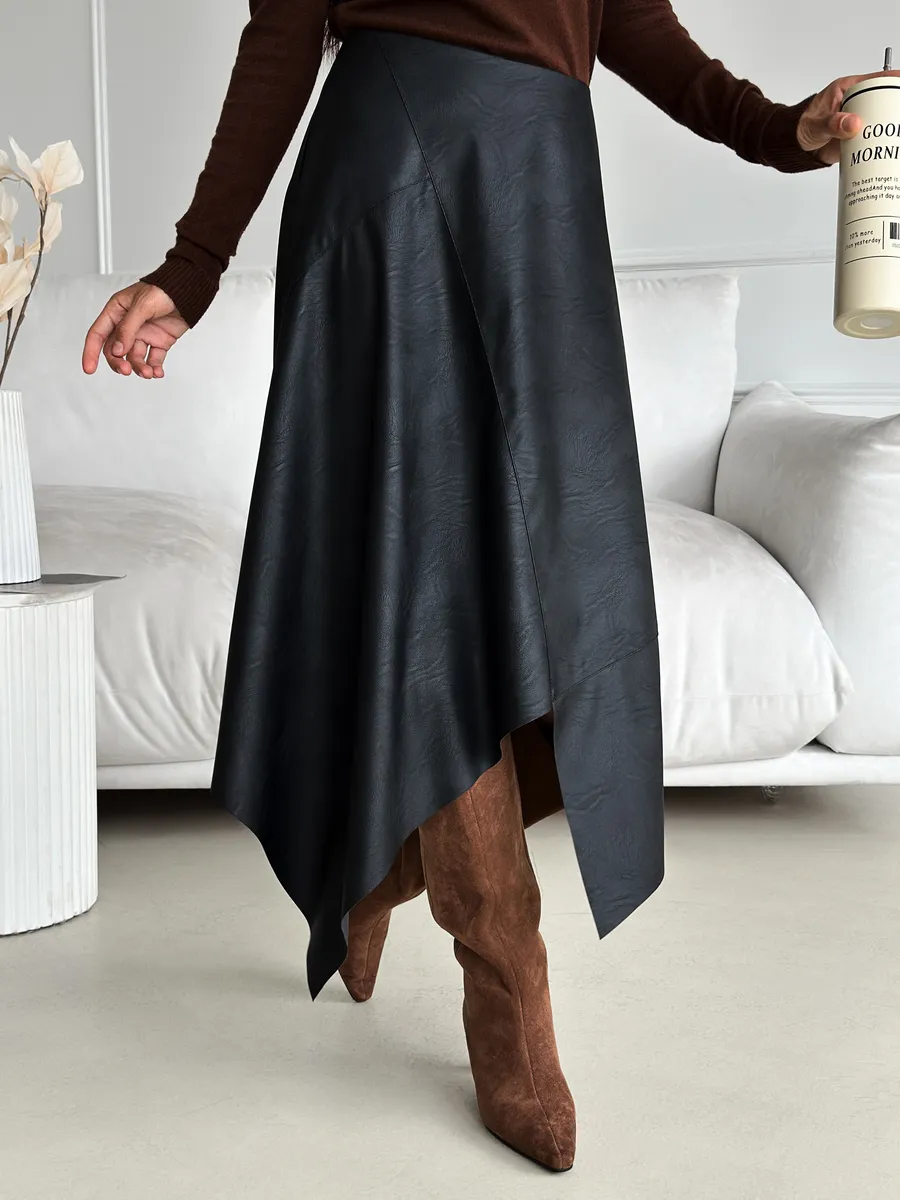 Стильная кожаная юбка с асимметричным кроем — это модная вещь для современной женщины. Выполненная из экокожи, она сочетает в себе трендовый силуэт трапеция и необычный разрез, который подчеркивает индивидуальность. Идеально для весеннего и зимнего сезонов. Клешевый фасон придает образу легкость и динамичность, а средняя длина миди подходит для офисного и нарядного стиля.
