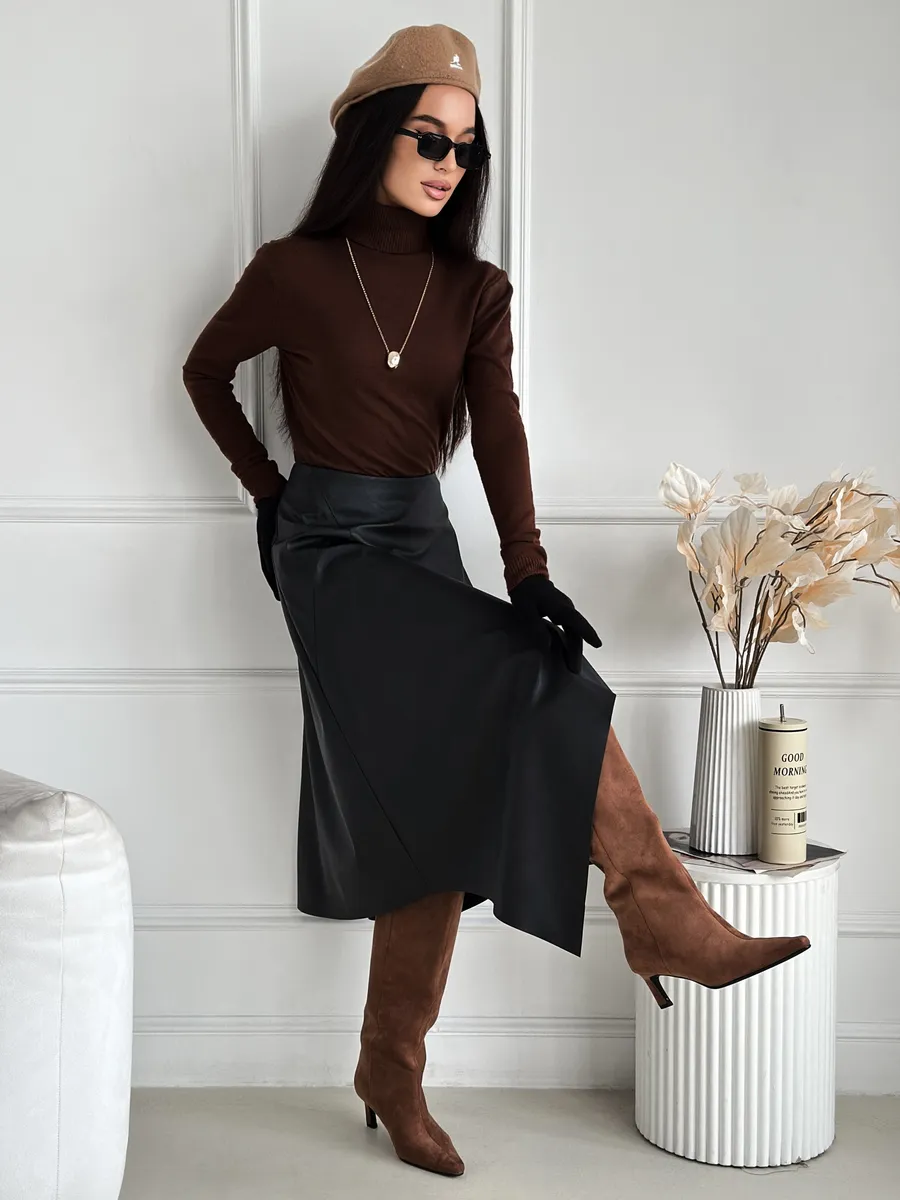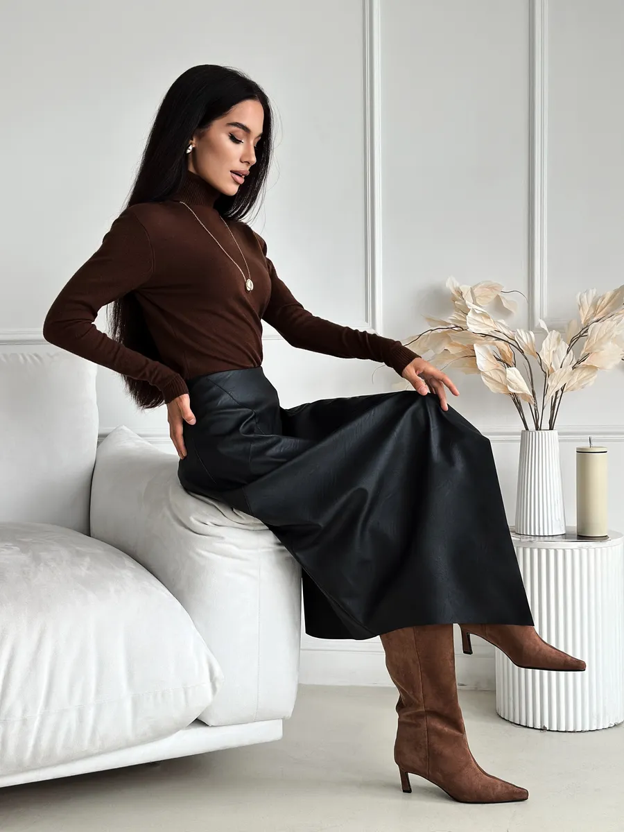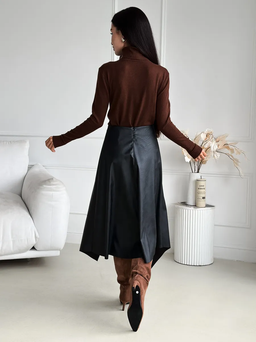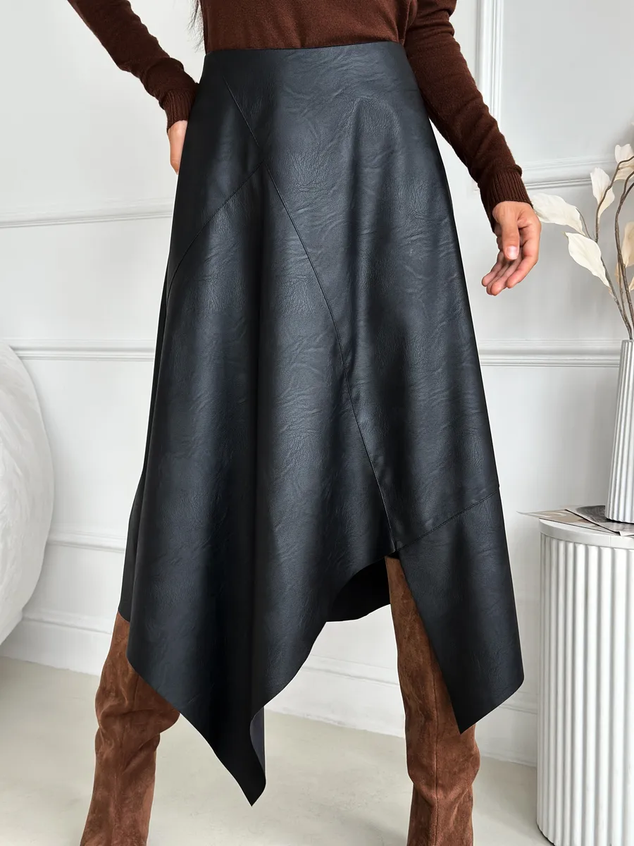 Стильная кожаная юбка с асимметричным кроем — это модная вещь для современной женщины. Выполненная из экокожи, она сочетает в себе трендовый силуэт трапеция и необычный разрез, который подчеркивает индивидуальность. Идеально для весеннего и зимнего сезонов. Клешевый фасон придает образу легкость и динамичность, а средняя длина миди подходит для офисного и нарядного стиля.