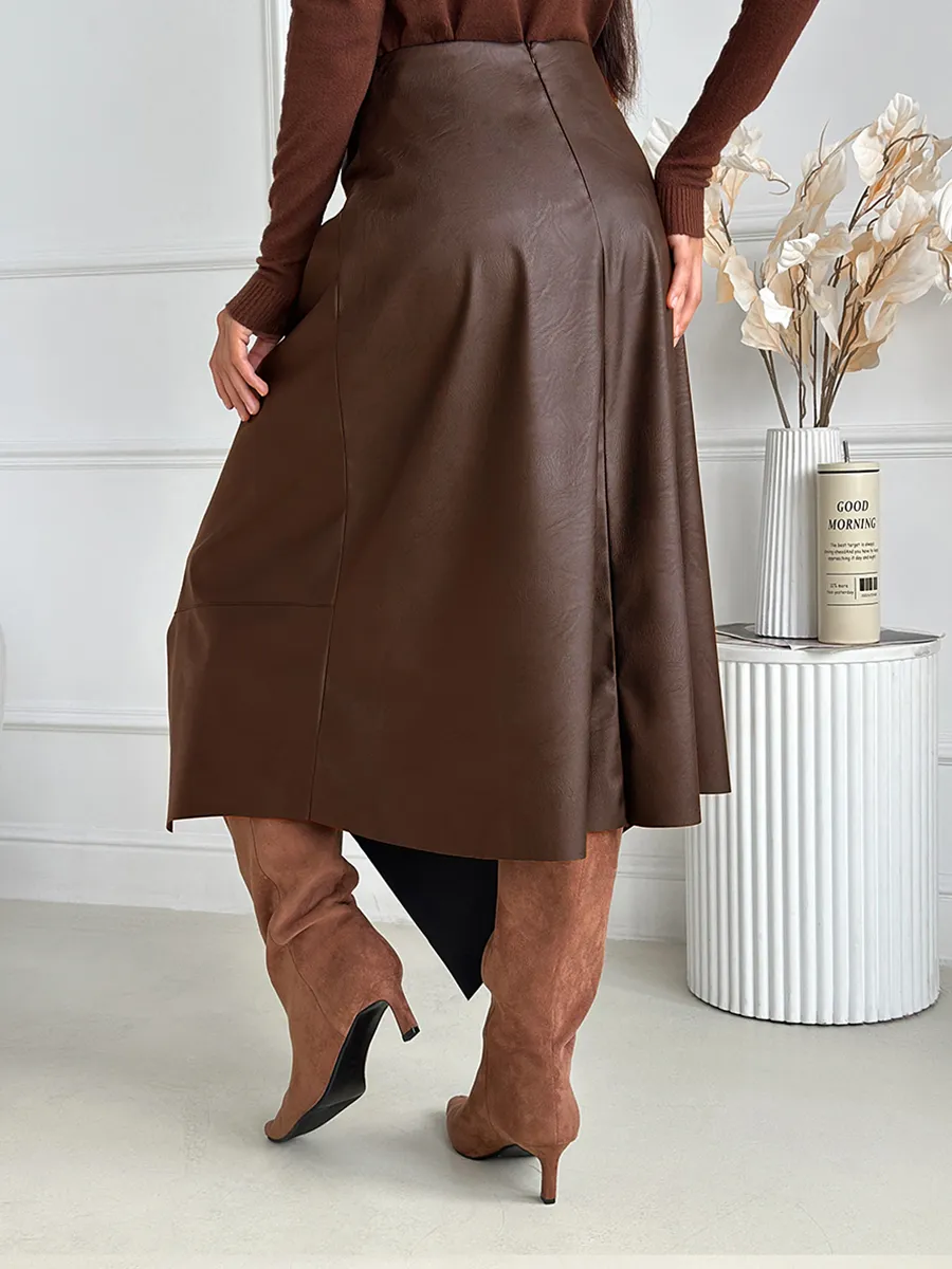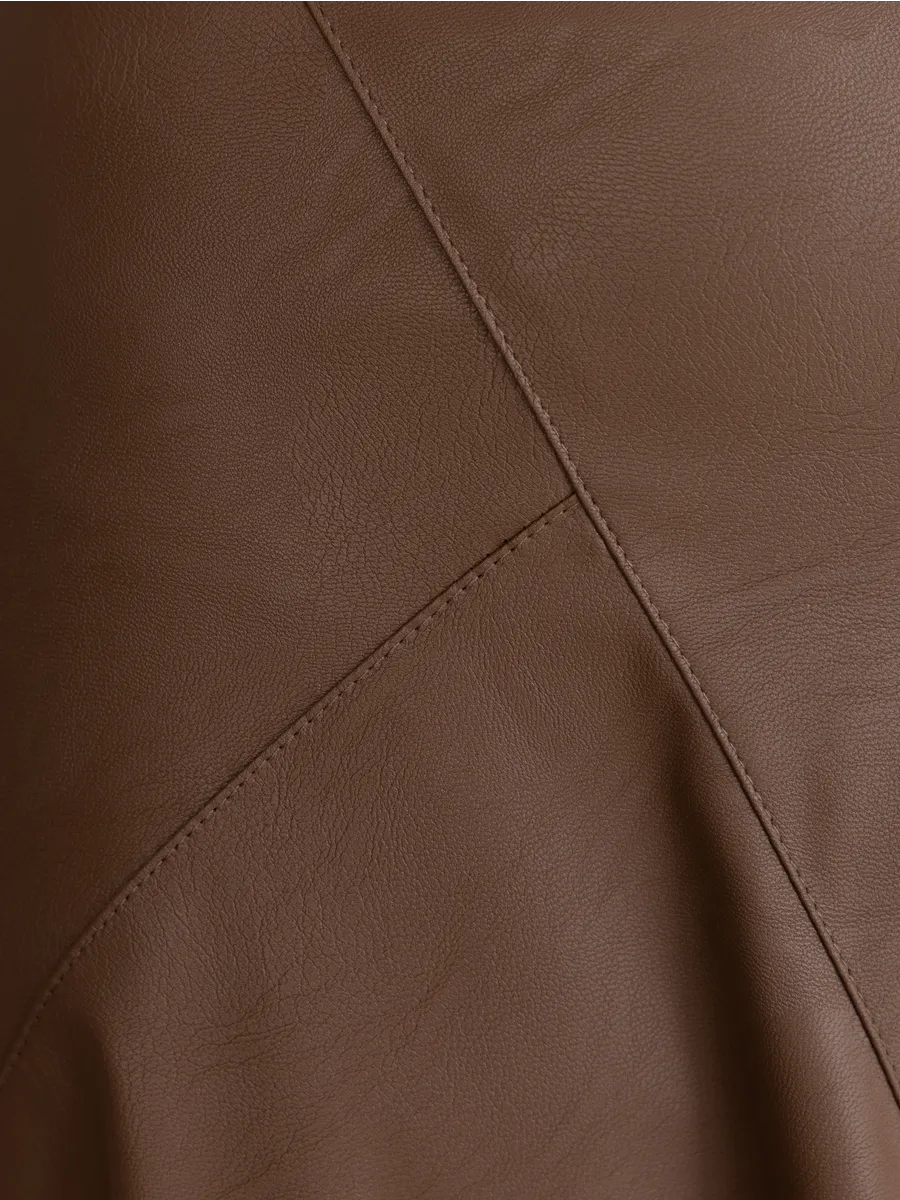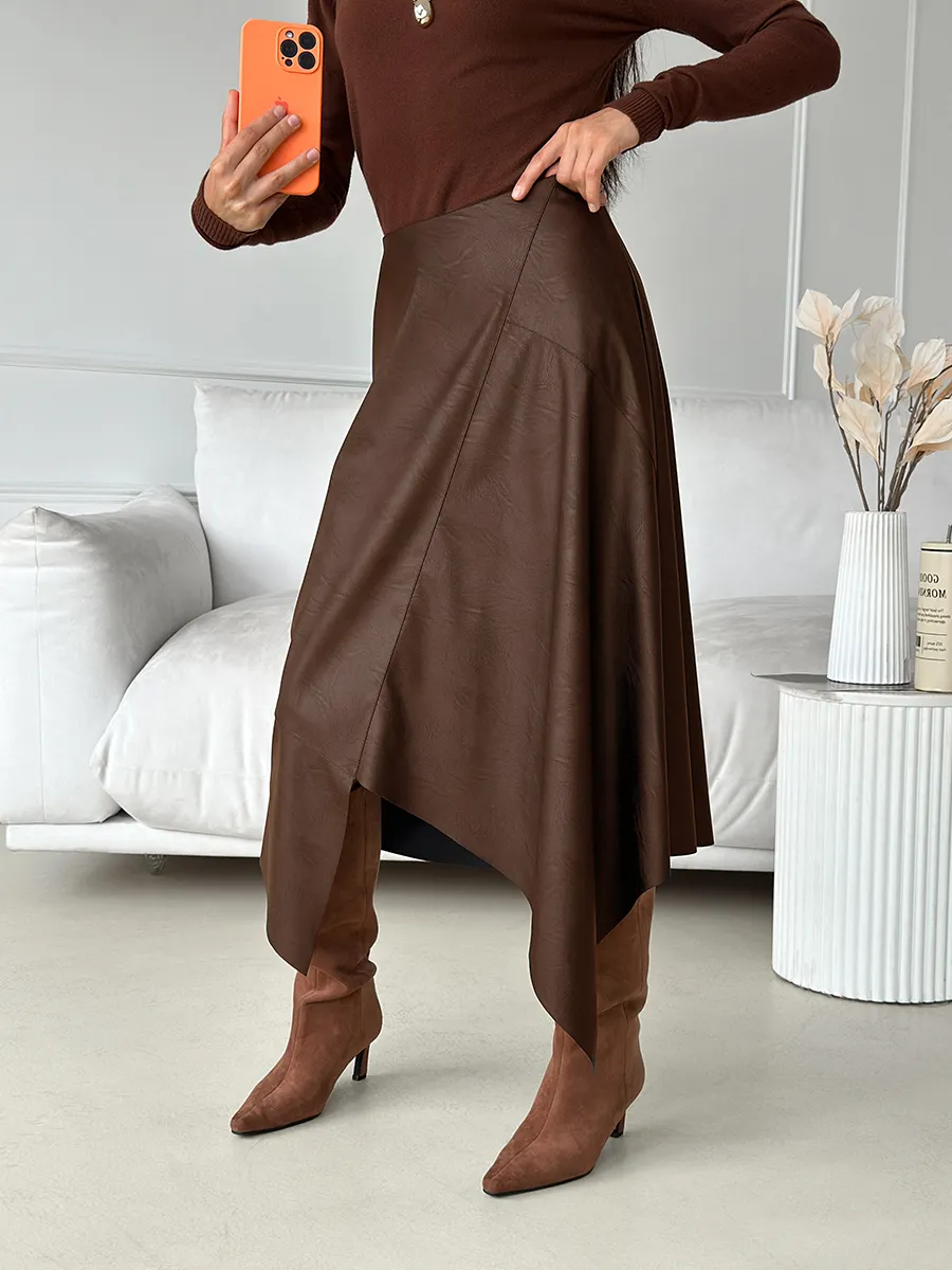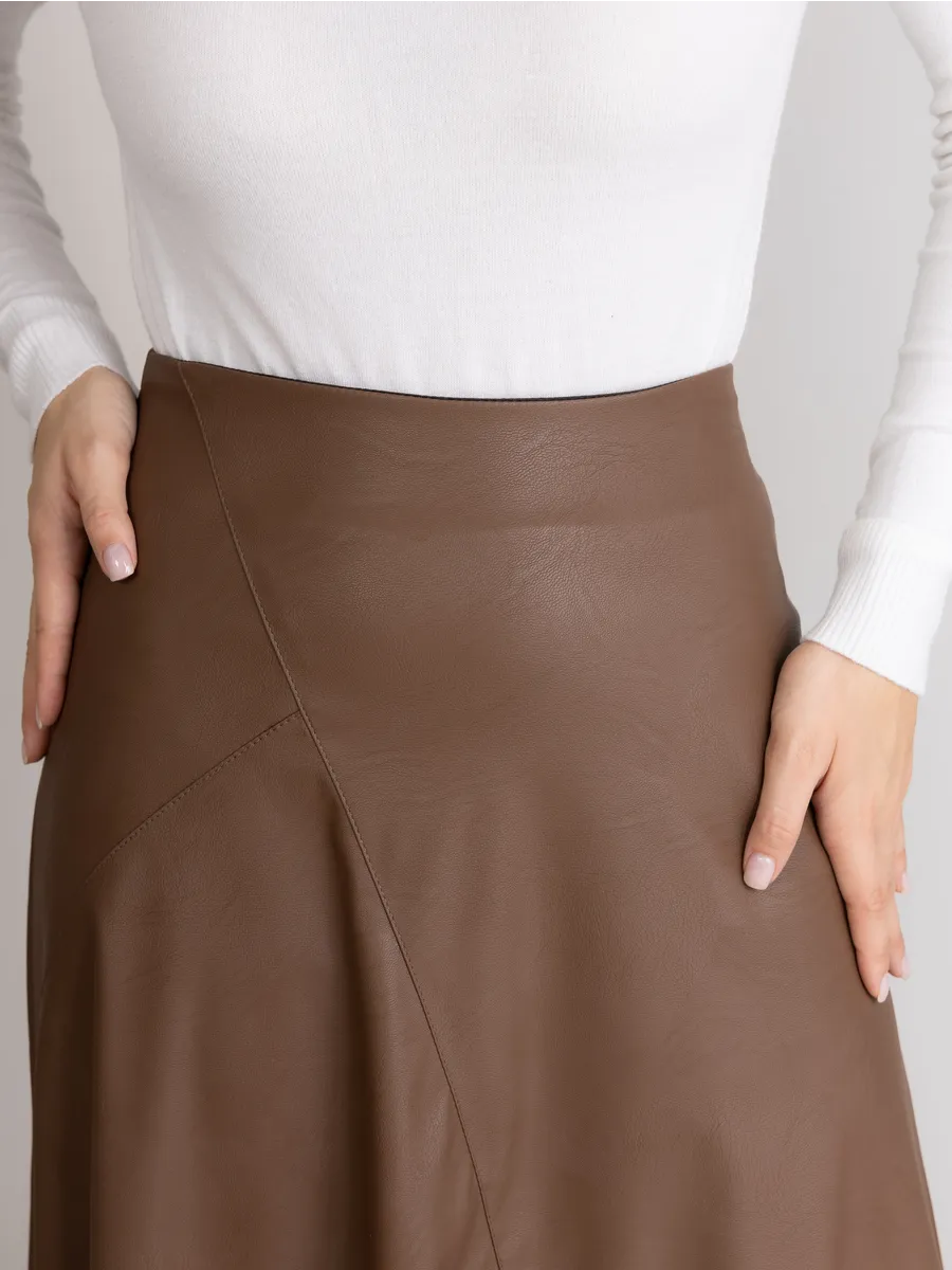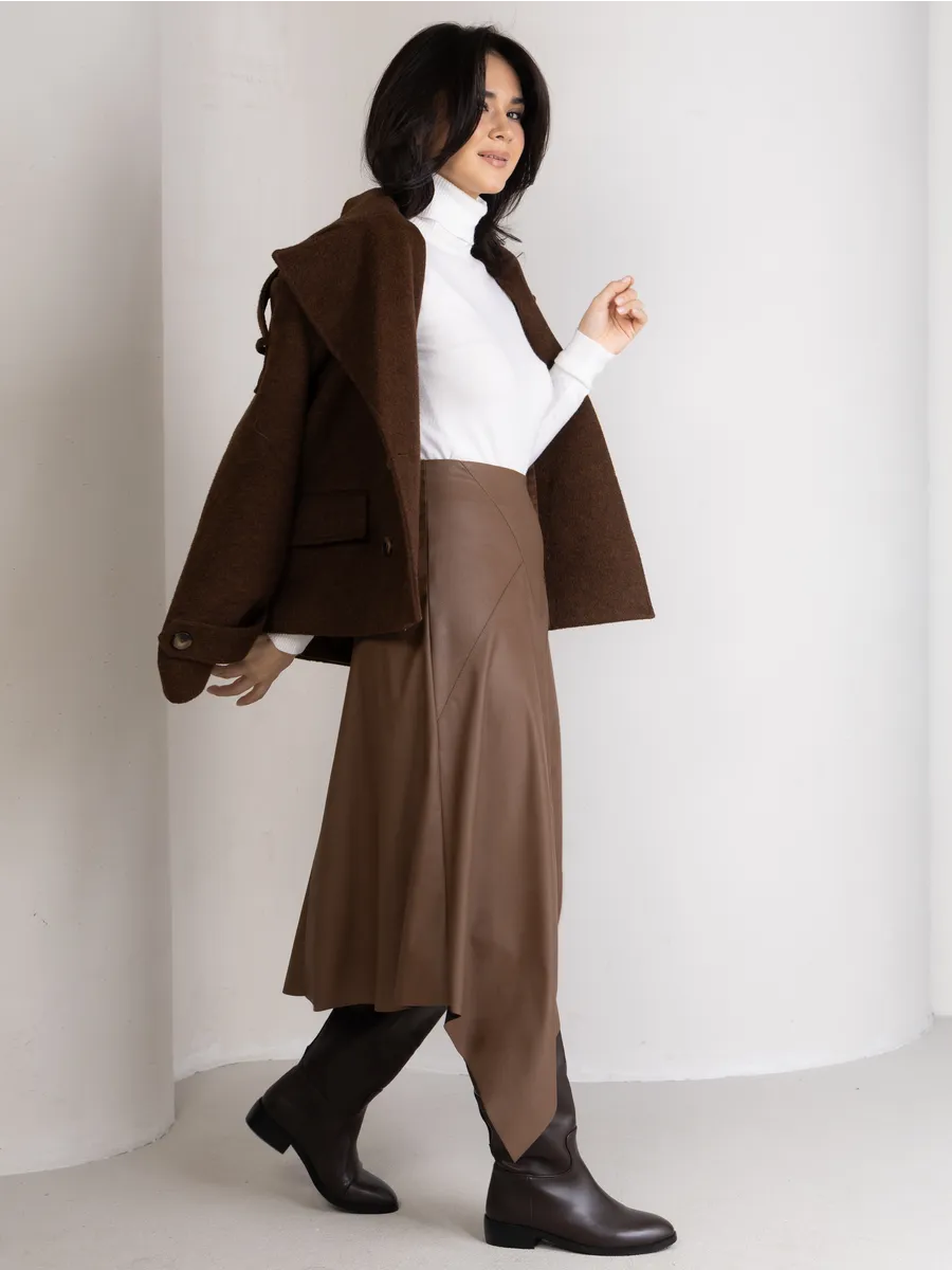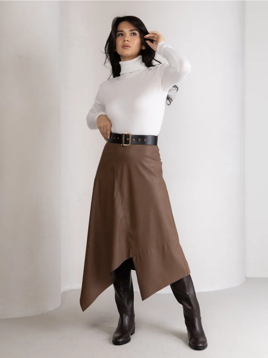 Юбка кожаная женская трапеция ассиметричная - универсальная и ультрамодная вещь для женщины, трендовая юбка сезона 2026. Эта необычная, красивая и стильная юбочка А силуэта, с ассиметричными рельефами и разрезом в виде клиньев, длины миди сшита из искусственной кожи. Мы используем экокожу премиум качества, она плотная, красиво струится в движении, не оставляет затяжек, не просвечивает. Длина миди и модель трапеция подходят для любого типа фигуры и роста, подчеркивая все достоинства тела. Кожанная юбка – базовая вещь в гардеробе у каждой девушки. Эта модная юбка подойдет для подарка. Вы сможете носить необучную одежду каждый день. Юбка большого размера, для полных, подчеркнет достоинства своей обладательницы и сделает образ легким.