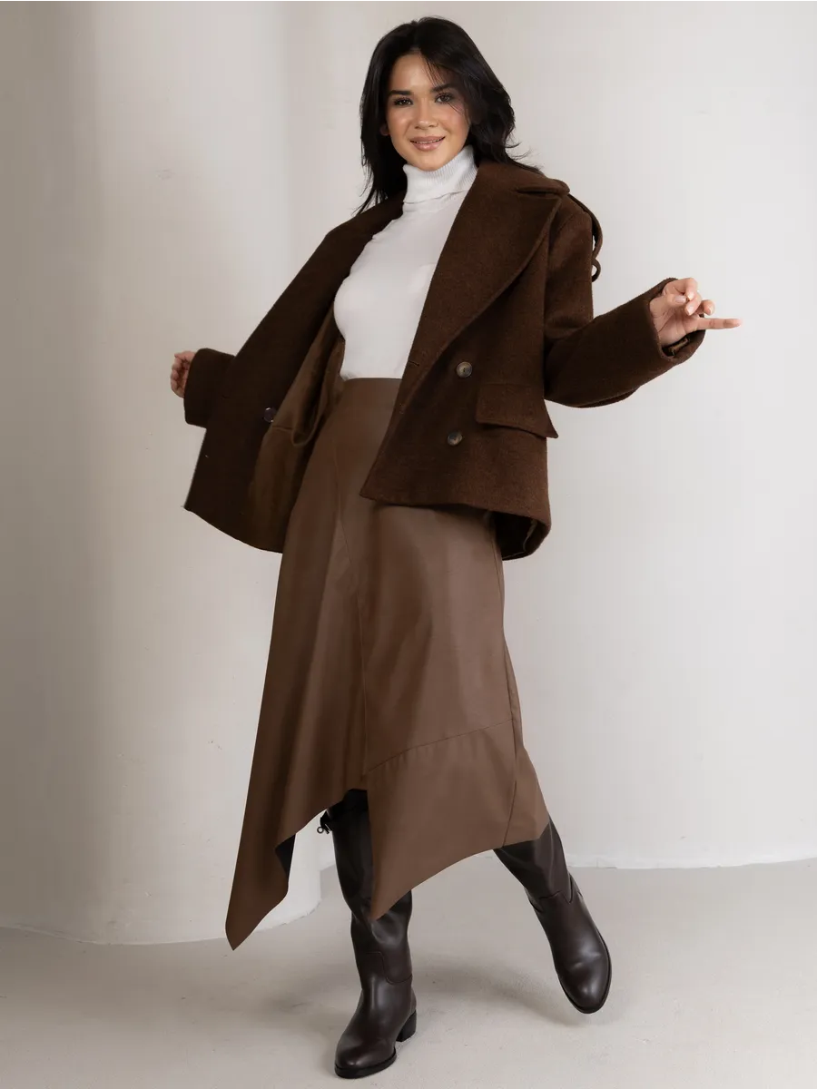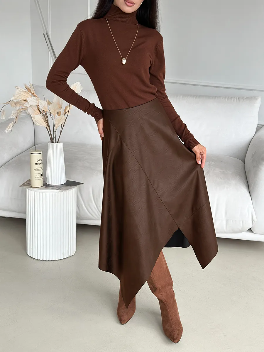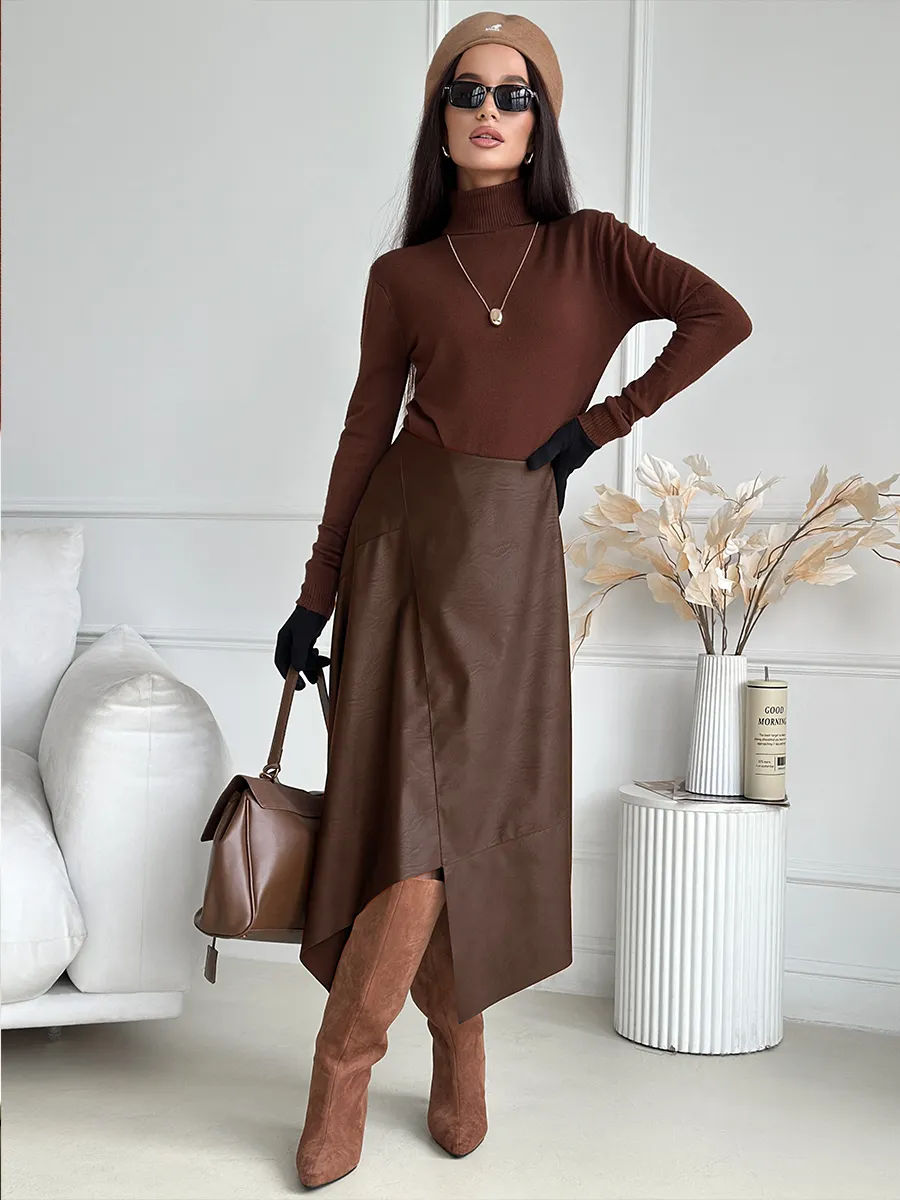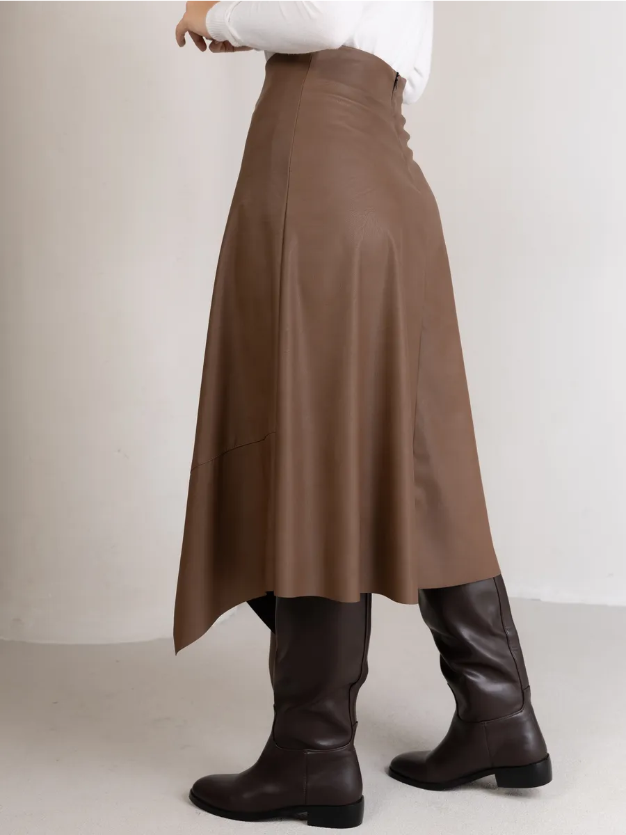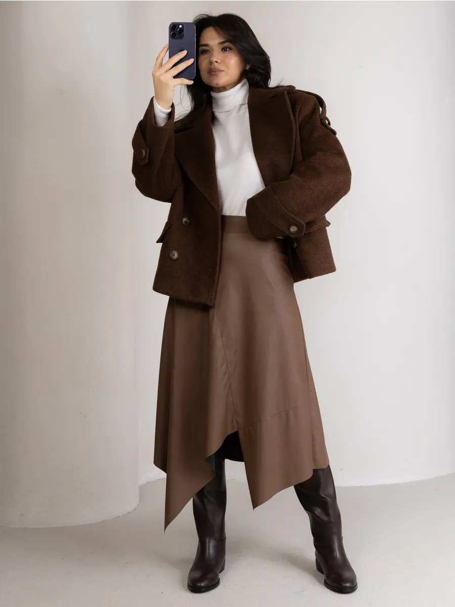 Юбка кожаная женская трапеция ассиметричная - универсальная и ультрамодная вещь для женщины, трендовая юбка сезона 2026. Эта необычная, красивая и стильная юбочка А силуэта, с ассиметричными рельефами и разрезом в виде клиньев, длины миди сшита из искусственной кожи. Мы используем экокожу премиум качества, она плотная, красиво струится в движении, не оставляет затяжек, не просвечивает. Длина миди и модель трапеция подходят для любого типа фигуры и роста, подчеркивая все достоинства тела. Кожанная юбка – базовая вещь в гардеробе у каждой девушки. Эта модная юбка подойдет для подарка. Вы сможете носить необучную одежду каждый день. Юбка большого размера, для полных, подчеркнет достоинства своей обладательницы и сделает образ легким.