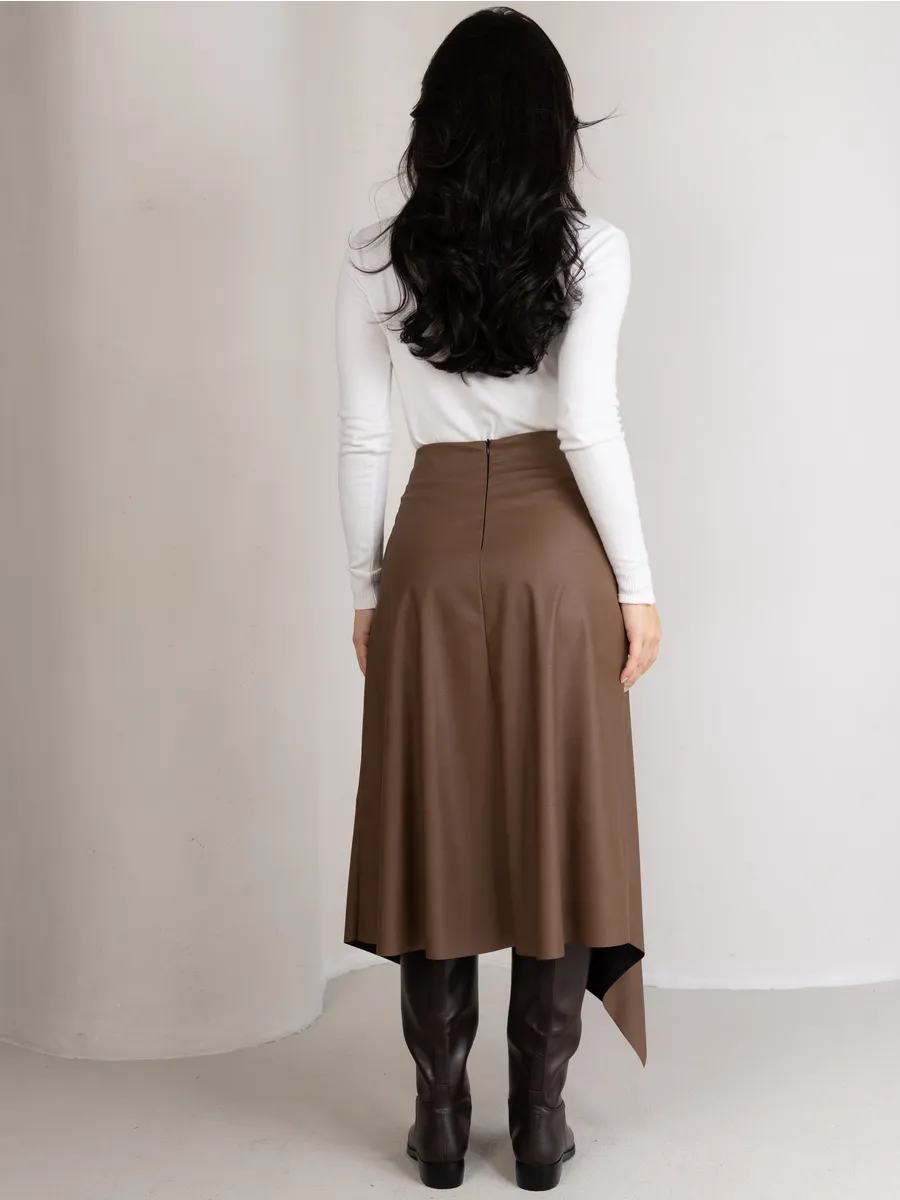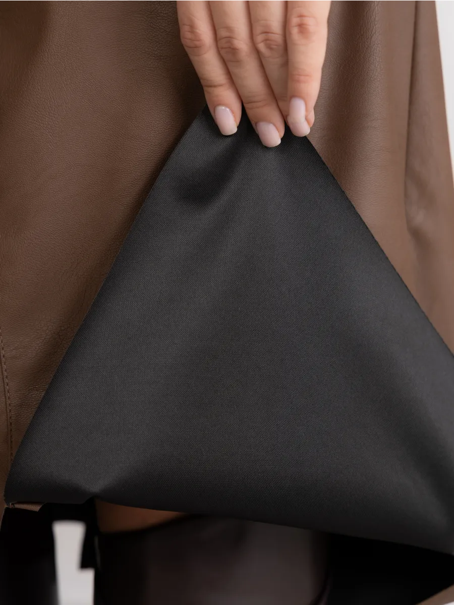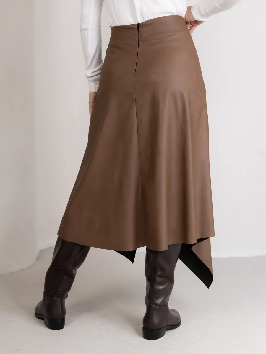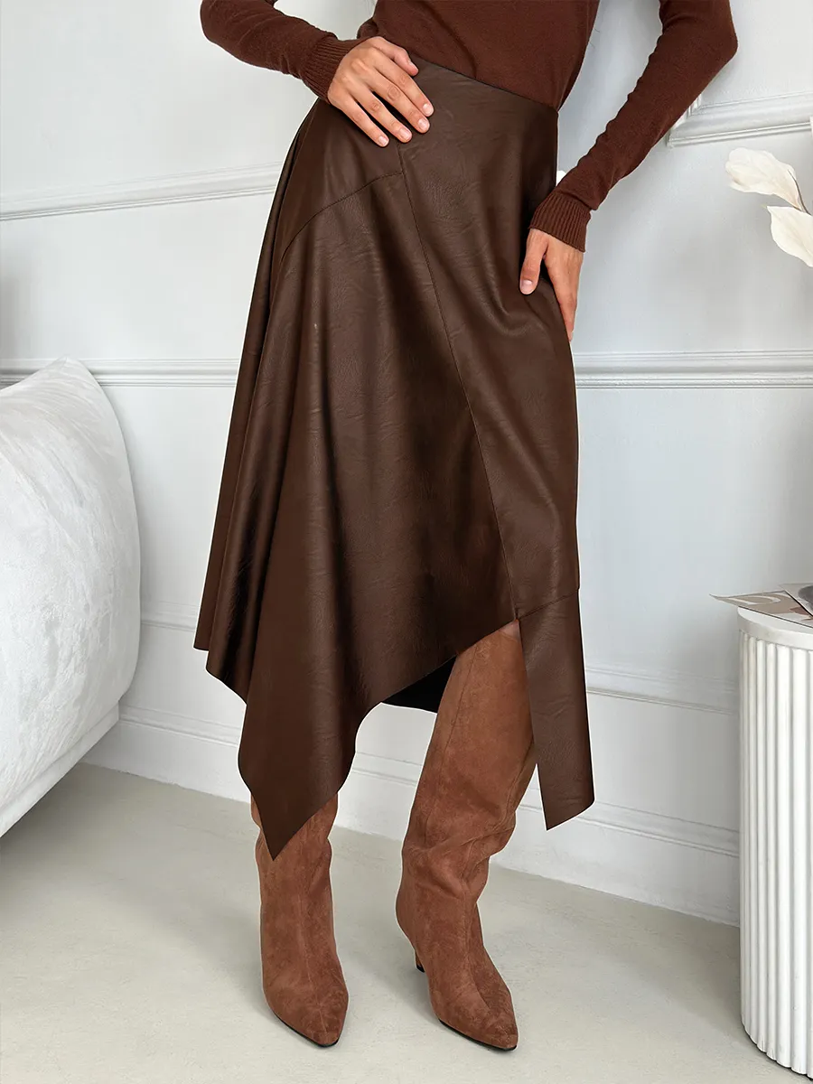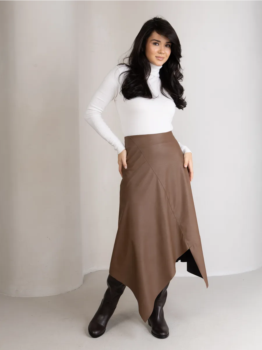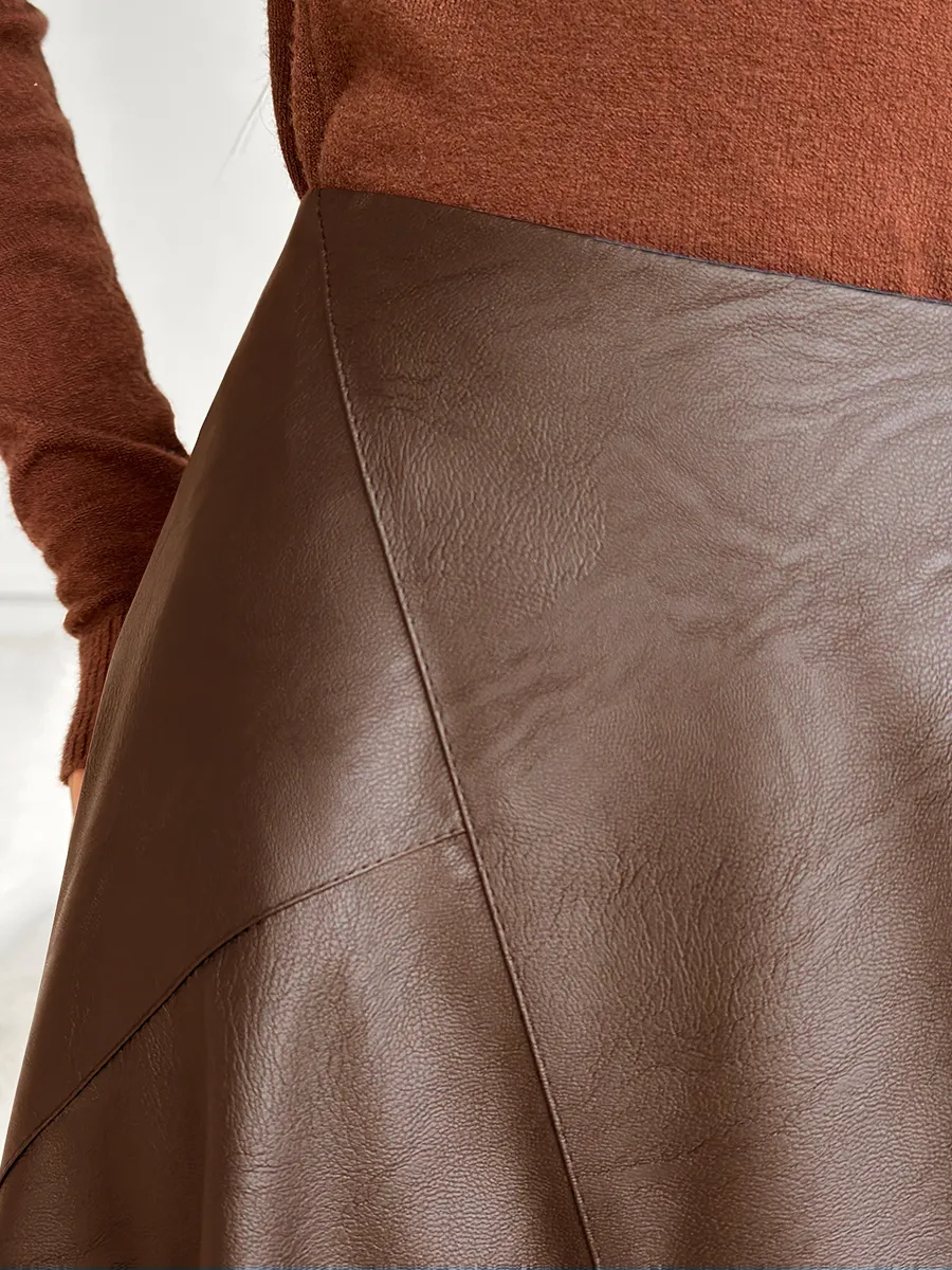 Юбка кожаная женская трапеция ассиметричная - универсальная и ультрамодная вещь для женщины, трендовая юбка сезона 2026. Эта необычная, красивая и стильная юбочка А силуэта, с ассиметричными рельефами и разрезом в виде клиньев, длины миди сшита из искусственной кожи. Мы используем экокожу премиум качества, она плотная, красиво струится в движении, не оставляет затяжек, не просвечивает. Длина миди и модель трапеция подходят для любого типа фигуры и роста, подчеркивая все достоинства тела. Кожанная юбка – базовая вещь в гардеробе у каждой девушки. Эта модная юбка подойдет для подарка. Вы сможете носить необучную одежду каждый день. Юбка большого размера, для полных, подчеркнет достоинства своей обладательницы и сделает образ легким.